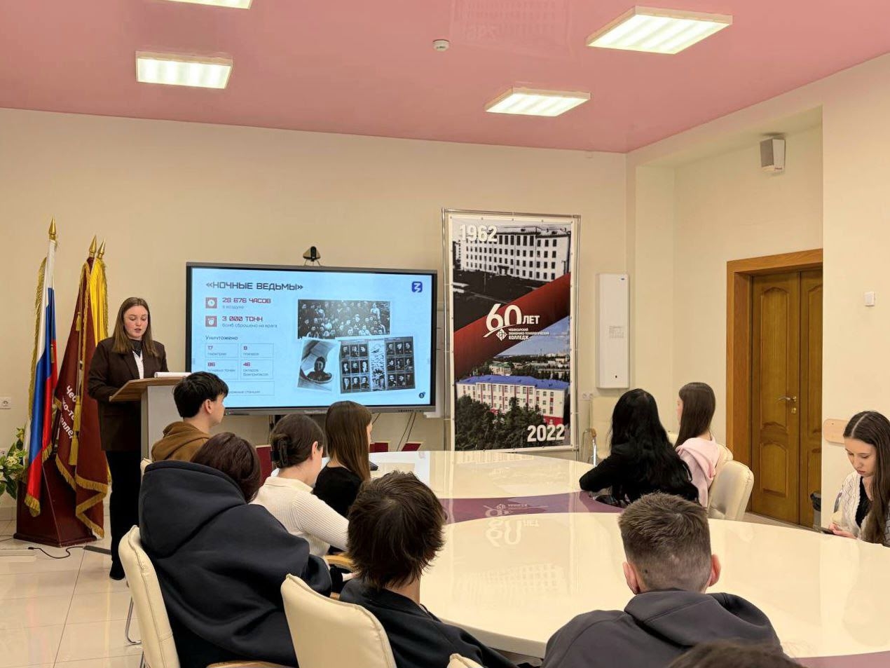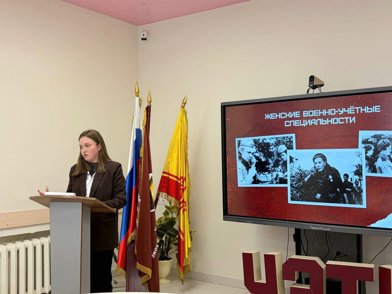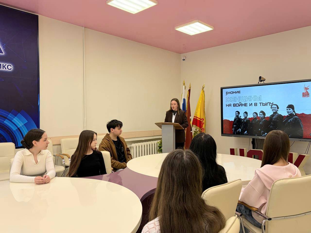 Студенты познакомились с разными женскими военно‑учётными специальностями: узнали о женщинах‑медиках, лётчицах, снайперах и героинях‑подпольщицах, а также о роли женщин в тылу.